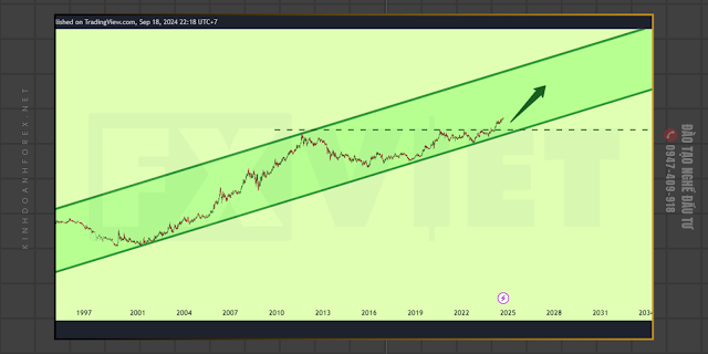 Biểu đồ cung cấp một cái nhìn tổng quan về xu hướng giá vàng trong một khoảng thời gian dài. Dựa trên các đường kênh (channel) được vẽ, các bạn Trader có thể nhận thấy: